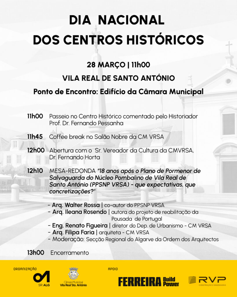 Neste sentido, a Secção Regional do Algarve da Ordem dos Arquitectos organiza, em parceria com a Câmara Municipal de Vila Real de Santo António, um passeio comentado pelo Centro Histórico e uma Mesa Redonda com o tema “18 anos após o Plano de Pormenor de Salvaguarda do Núcleo Pombalino de Vila Real de Santo António - que expectativas, que concretizações?”, que irá decorrer no dia 28 de março, pelas 11h00, no Salão Nobre da Câmara Municipal de VRSA.