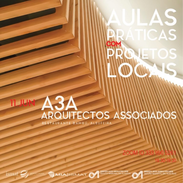 Ciclo de conferências “Aulas Práticas com Projetos Locais” no âmbito do curso Mestrado Integrado em Arquitetura MIA-ISMAT, numa organização conjunta com as Secções Regionais do Algarve e do Alentejo da Ordem dos Arquitectos que, a partir de obras locais, visa aproximar os alunos à prática da Arquitetura. Esta oitava edição contará com a apresentação do projeto do atelier A3A Arquitectos Associados.